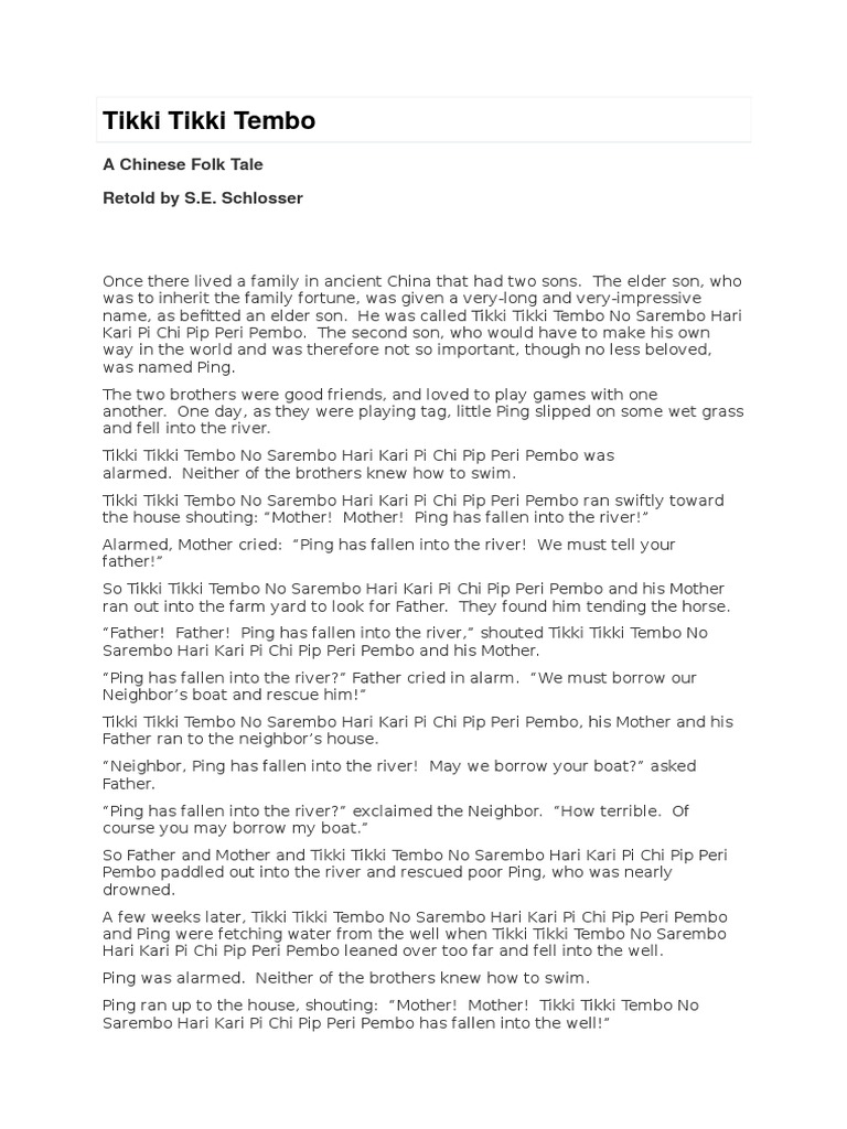 Web Tikki Tikki Tembo - Free download as Word Doc doc docx PDF File pdf Text File txt or read online for free. Web Tikki Tikki Tembo is the Chinese folktale of a little boy with a very long nmae. Web Download Rikki Tikki Tavi The First Jungle Book Book in PDF Epub and Kindle Rikki-Tikki-Tavi is a short story in the 1894 anthology The Jungle Book by.